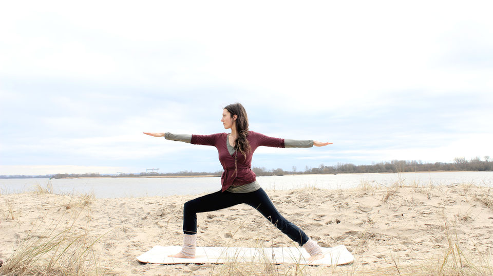 Der Sand unter den Füßen, der Wind auf der Haut, die Sonne am Himmel, das Rauschen der Blätter und das fliessende Wasser der Elbe lassen in dieser Yogastunde die
